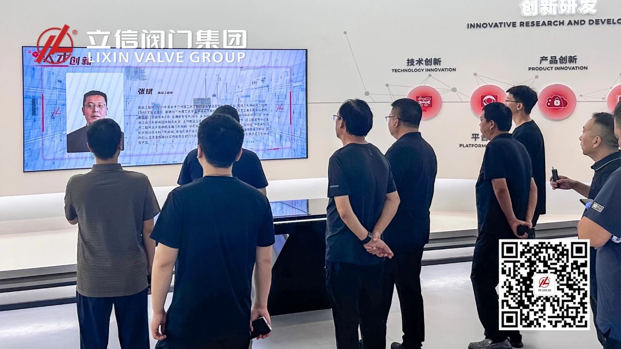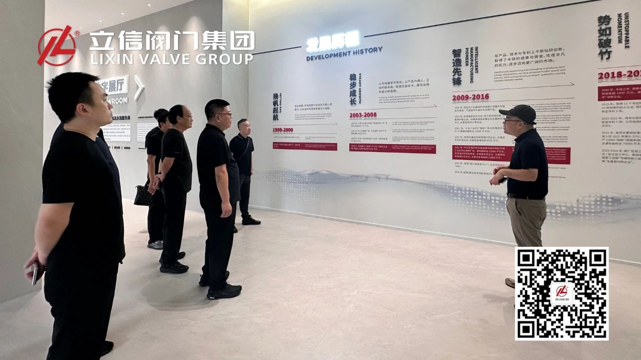 在集团数字展厅,连洪涛书记一行详细了解了立信阀门自成立以来的发展历程、科技创新成果以及核心产品的应用领域。连书记对立信阀门在智能制造、核心技术研发及品牌建设方面取得的成绩给予高度评价,并积极关注企业在行业中的领军地位和广阔市场前景。