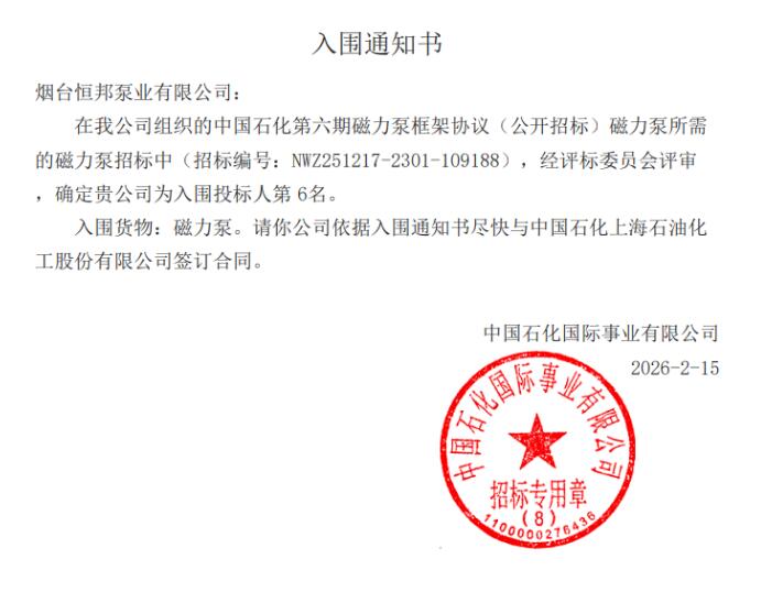 近日,中国石化第六期磁力泵框架协议招标结果正式公布,烟台恒邦泵业有限公司凭借过硬的技术实力、稳定的产品品质与完善的服务体系,成功入围磁力泵、重载荷磁力泵两大标段,成为中石化磁力泵集采合格供应商。